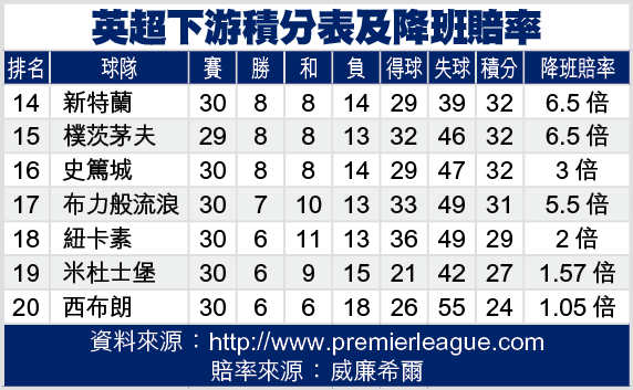 米堡暫列19位,球會主席史堤芬吉遜表明不會炒領隊修夫基,但以球隊疲弱攻力,恐怕球會上下也打定輸數,來季在英冠見;另一降班位置方面,第3熱門紐卡素形勢亦欠佳,餘下8場比賽中,要面對車路士、利物浦、維拉等搶分球隊,尤其舒利亞接任首仗,就要主場面對車仔,亦要面對史篤城、樸茅等同級對手;來回6分的關鍵大戰,在5月9日紐記主場對米堡,不單是東北打吡戰,更可能是「你死我亡」的護級大戰。