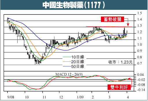 中國生物製藥(1177)公佈截至08年12月底止年度業績,純利2.98億元,上升32.7%,每股盈利13.15仙,派末期息2仙。業績報表顯示,公司手持現金多達18.75億元,相當於公司市值27.85億元的67%,加上季度派息政策,現價往績PE僅9倍相當超值。此股短炒動力或會較遜,但緩慢上升也可以帶來理想回報。建議1.20至1.26元買入10萬股,目標1.60元,跌穿1.05元止蝕。