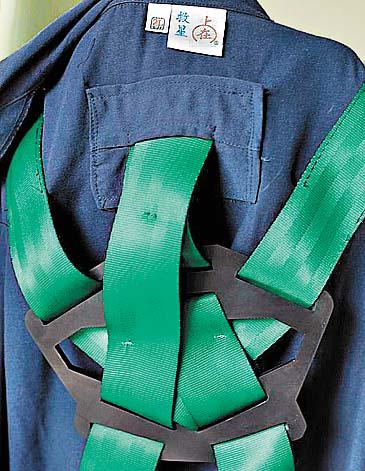 這個名為「具安全帶之工作服」的發明,有2,600公斤以上的抗壓力,工作服上配有抗拉力的安全帶及緩衝墊片(圖左),在萬一墮落時可減輕挫傷疼痛,將成為工程人員保命服。