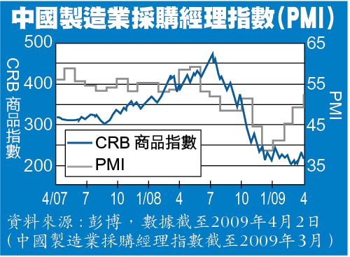 此外,近日各國公佈的經濟數據較市場為佳,令投資者憧憬環球經濟或有機會於今年底時走出谷底,亦是另一個支持近日商品價格回升的重要因素。美國於上周公佈的2月份工廠定單,就為過去7個月以來首次上升。中國經濟前景亦有轉強迹象,中國製造業採購經理指數(PMI)於3月份報52.4,不但高於界定經濟擴張及收縮的50分界線,且為連續第4個月上升(圖)。