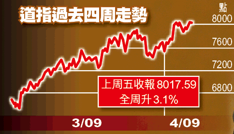 美股方面,儘管美國失業率創25年高位,但聯儲局主席伯南克稱會致力穩定銀行業,刺激銀行股勁升,加上著名手機生產商RIM業務理想,股價漲21%,令道指上周五轉跌為升,收市微升39點至8017點,接近全日高位收市,是近兩個月來首次收高於8000點;納指漲19點,收報1621點。全周計,道指升3.1%,且連升4周累漲21%,升幅是1933年以來最勁。VIX波動指數3個月來首次跌穿40,反映市場情緒好轉。