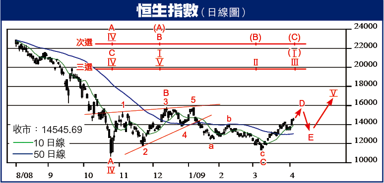 「次選」為沿用的模式:巨浪IV的大浪A低位為08年10月27日的10676(H指4792),12月11日高位15781(H指為1月7日的8774)為大浪B中浪(A)反彈高位。中浪(B)於3月9日的11345見底(H指為3月3日6404),目前為中浪(C)小浪c的上升,第一個目標可達15700/15800,最大阻力區可達16500附近(H指8700/8800)。
