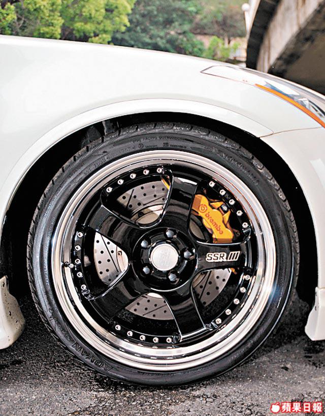 350Z二手價約30萬,Tino花10萬改裝,聽落唔算大數目,「因為所有錢擺晒落裝飾,引擎、避震等Performance嘢完全無郁過,10萬蚊主要係買包圍、換4條245/385ZR19薄胎同SSR輪圈,最貴套Brembo鮑魚(煞車卡鉗),成二萬幾蚊,所以我呢架350Z超好收。」