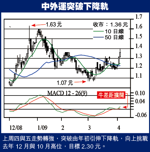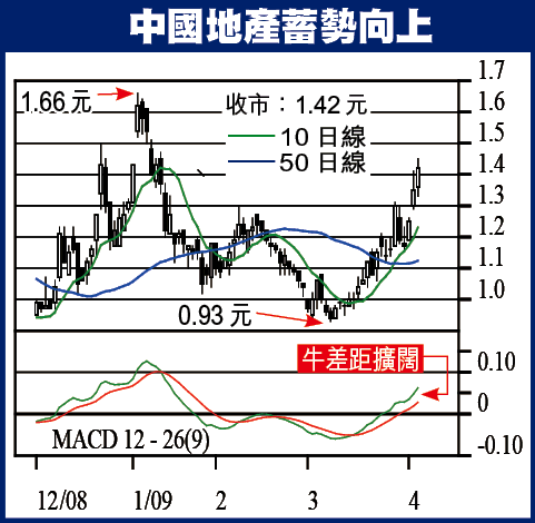 FollowMe今年1月推許中國地產為09年「明日之星」,短期睇2.06元,中期4元,升至1.66元後回落,3月重納升軌,上周五升至1.45元,收1.42元,連續兩日大成交,MACD牛差距擴大,20日線剛重越50日線,技術指標皆呈向好,料可一衝而破年初高位1.66元。