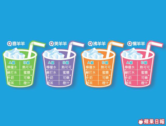 懶羊羊和三位朋友開派對,每位都點了用A組及B組飲品各一調製的特飲,你能憑提示知道牠們喝些甚麼嗎?(飲品絕不重複!)