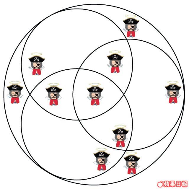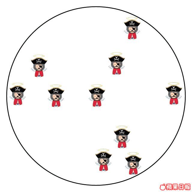 草原有10隻海盜羊,牠們都是新居民,村長慢羊羊要為牠們劃分居住地,大家能否幫忙,在圓形大草原上畫3個小圓圈,令每隻羊都處於獨立空間,和其他羊分開。提示:3個小圓圈大小相若,但羊兒所佔空間則大小不同。