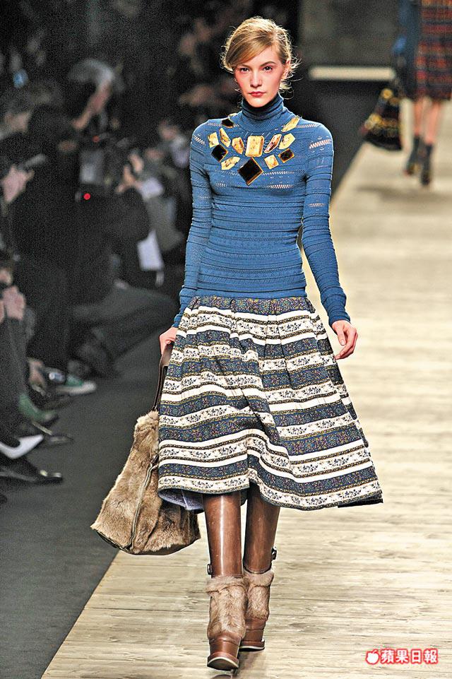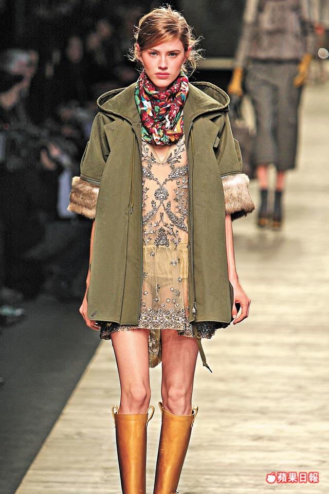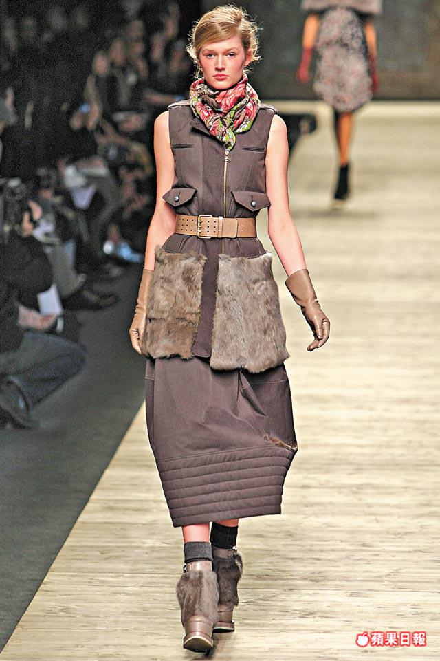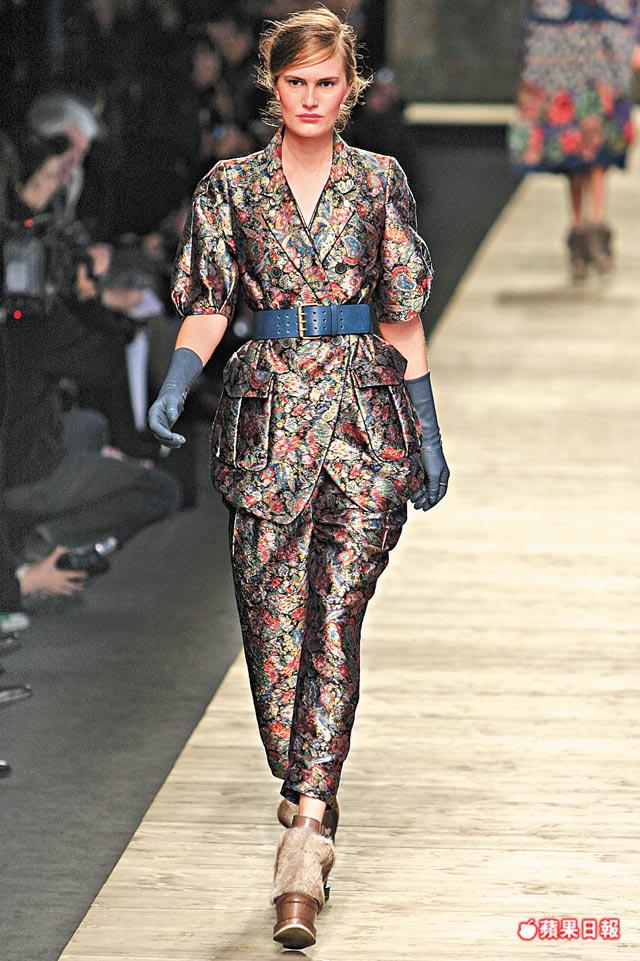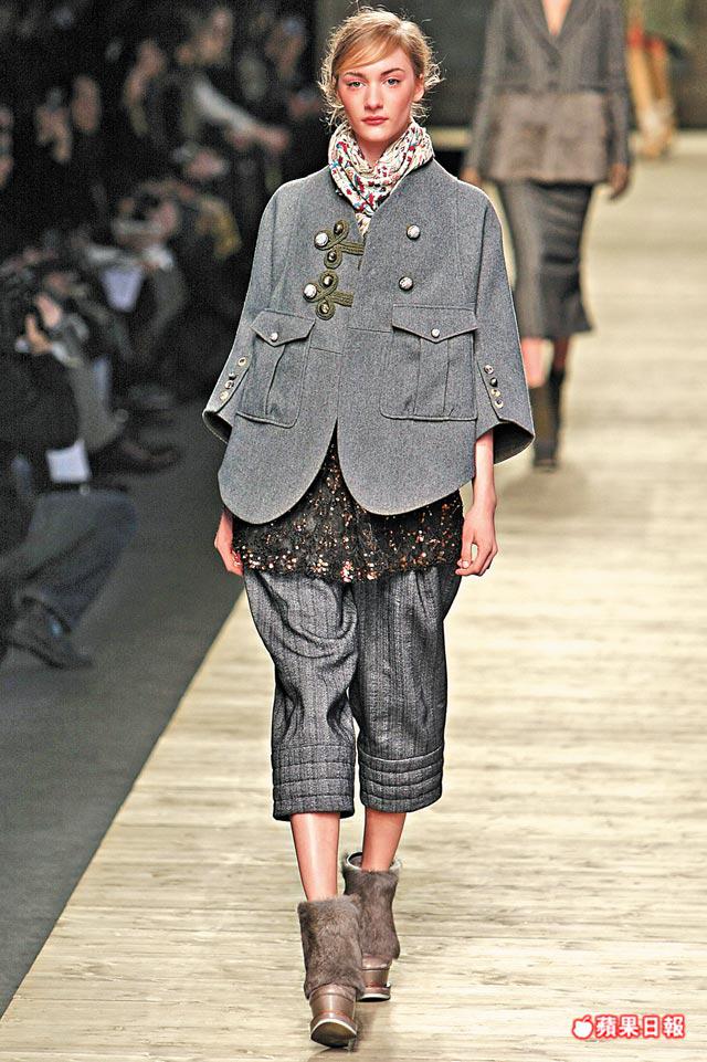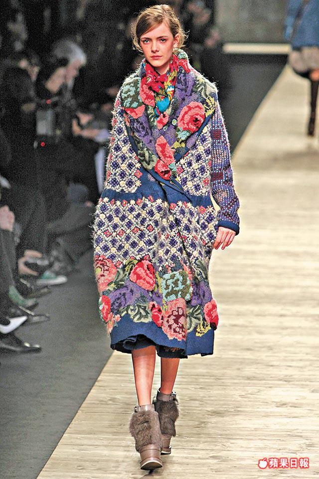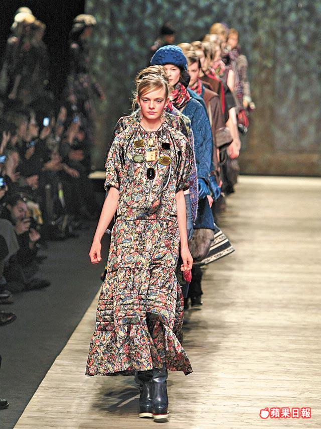 好男好女混雙項目包括有squarefurpocketedvest襯花卉裙、mannish條子flanneljacket綴一幅thickfur、多色knitcoat、armycoat襯釘亮片裙、刺繡外套和cargopants、cherryprintcable-knitdress、duchessesatinfloralbubbledress等。