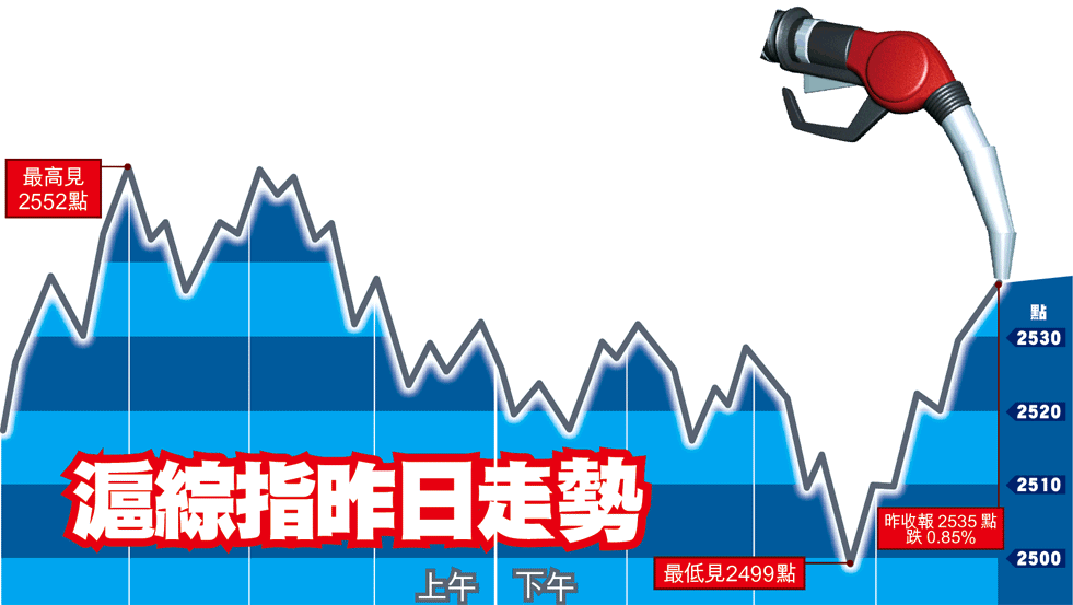滬綜指昨收2535點,跌21點(0.85%),深成指挫152點(1.56%),收9640點;兩市總成交回升9.6%至2398.49億元。天相投顧研究報告指,基金持有股票比例兩極化,持有90%以上或60%以下的基金數目正增加,但大部份基金經理暫無減倉計劃。截至上周五數據顯示,股票型基金平均持倉比例為81.42%,較上周增加0.62個百分點,為今年以來新高。