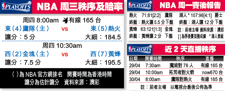 黃蜂大災難!西岸第7位的黃蜂周一主場以63:121大敗予金塊,輸足58分,平了NBA歷來季後賽單場最大落敗分差紀錄;黃蜂核心控衞基斯保羅(CP3)負傷上陣下,創下個人季後賽單場得分新低4分,令黃蜂以總場數落後1:3金塊,跌落出局深淵。