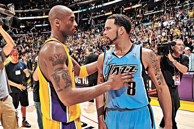 湖人主場以107:96擊敗爵士,總場數贏4:1晉級次圈;圖為拜恩(左)賽後勉勵爵士的迪朗威廉士(右)。GettyImages