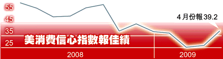 美國經濟諮商局4月份消費信心指數由26急升至39.2,是3年半最大升幅,對未來六個月的預期信心指數亦飆升至49.5,反映市場憧憬衰退已放緩,兩大零售股沃爾瑪及家得寶帶動大市回升,兩者早段漲1.8%至2.3%。里士滿聯儲銀行本月製造業指數由負20大升至負9,勝預期。儲局推低按揭息率,加上華府為首次置業者提供稅務優惠,反映美國20大城市樓價的標普/CaseShiller樓價指數在2月份按年跌幅放緩至18.6%,勝預期,按月跌2.2%。