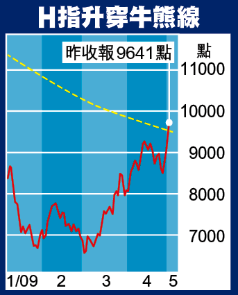 這邊廂恒指疑似牛市之際,代表中資股的H股指數則確診牛市。內地上月採購經理指數向好,H股昨狂飆557點(6.13%),報9641點,突破牛熊分界線,包括工行(1398)、中石化(386)、神華(1088)、平保(2318)等重磅股,昨日相繼以大成交突破牛熊線。