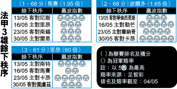 法甲尚餘4輪,基本上只得前3位的馬賽、波爾多及里昂有爭標希望,以餘下秩序看,第2位的波爾多對手較弱,難怪被足智彩列為1.65倍大熱。