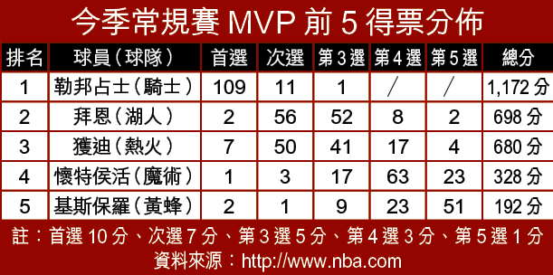 【綜合美國外電】騎士「大帝」勒邦占士,大熱膺今季常規賽「最有價值球員(MVP)」;他獲得121名採訪NBA的記者、編輯及評論員中109張首選票,以總分1,172分當選(見附表),成為騎士首位獲此殊榮球員。