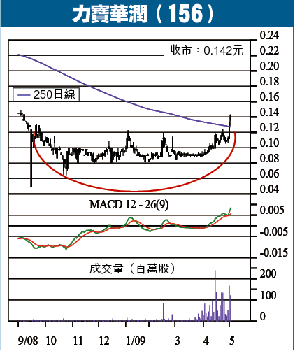 力寶華潤(156)連升兩日,噚日高收14.2仙,兩日累積上升28%,但在呢個大旺市中,只算係小兒科,同每股資產淨值相比,仲係大幅折讓,大偏低股發力,升一倍唔難。