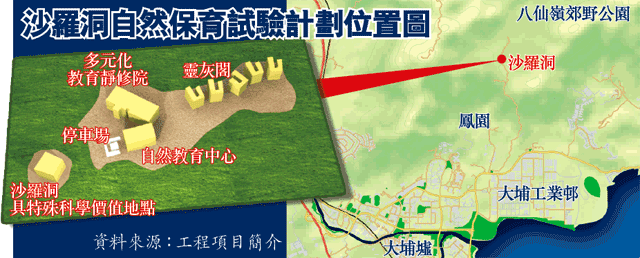 【本報訊】破天荒的「死人供養生境」保育大計,進入諮詢階段。環保團體綠色力量與私人發展商合作,在沙羅洞興建容納六萬個靈位的骨灰龕,並設立靈修院及自然教育中心。綠色力量保證沙羅洞生境不受破壞,但其他環保團體對骨灰龕造成的滋擾則深表憂慮。 記者:蔡元貴