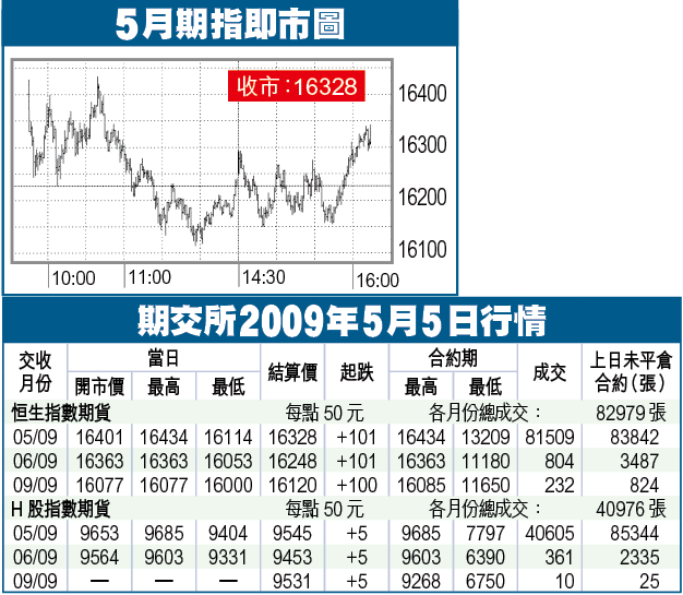 期指走勢偏穩,早段高開後抽升至16434,其後作技術調整,惟沽壓不大,以16328收市,升101點,低水收窄至102點。