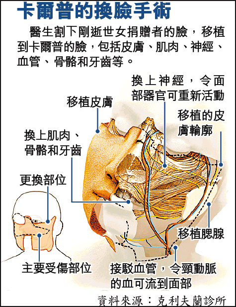 醫生為卡爾普作了30多次整容手術,取出部份肋骨做顴骨,拿腿骨做上顎,但始終未能改善儀容。此外她要靠儀器呼吸,用輸送管吃流質食物,活得很辛苦。克利夫蘭診所顯微外科醫生西米奧諾,決定為她作全球第四宗換臉手術,換臉的面積達80%,是歷來最大,且是首次將骨骼、肌肉、皮膚、血管和神經一併移植。