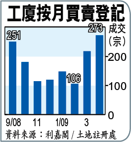 【本報訊】樓市小陽春由住宅市場擴散至工廈,利嘉閣資料顯示,上月有273宗工廈買賣登記,不僅較3月218宗增加25.2%,並創近8個月新高。但因成交集中在200萬元以下細價貨,總值按月下跌13.3%至7.57億元。