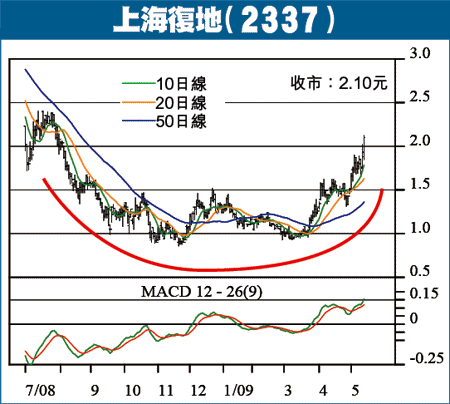 上海復地(2337)今年3月底曾作推介,當時剛呈圓底突破,發展至今,圓底突破走勢確立,本月初已升穿250日線,本周10日線與20日線進一步升穿250日線,升浪進入加速期。買賣策略:近日內房股漲勢甚速,復地若出現後抽,可在2元水平買入4萬股,目標2.40元,失守1.80元止蝕。