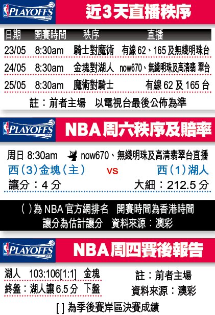 金塊再沒有讓勝利在手中溜走!周四NBA西岸決賽,有安東尼攻入34分的金塊改善了籃板和罰球死穴,作客以106:103險勝湖人,將總場數追成1:1。第3戰將移師金塊的百事中心球場舉行,且看主隊能否乘勇再下一城(無綫明珠台、高清翡翠台及now670台直播)。