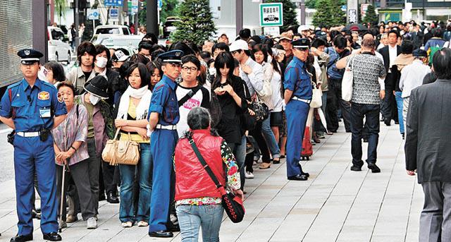 日本經濟陷入低谷,但東京銀座的法國珠寶店Mauboussin,昨早(周一)卻大排長龍(下圖),人龍綿延多個街口,難道珠寶都要大平賣﹖其實是珠寶店出招拉客,向首5,000名顧客贈送0.1卡、價值5,000日圓(409港元)的迷你鑽石(圖)。