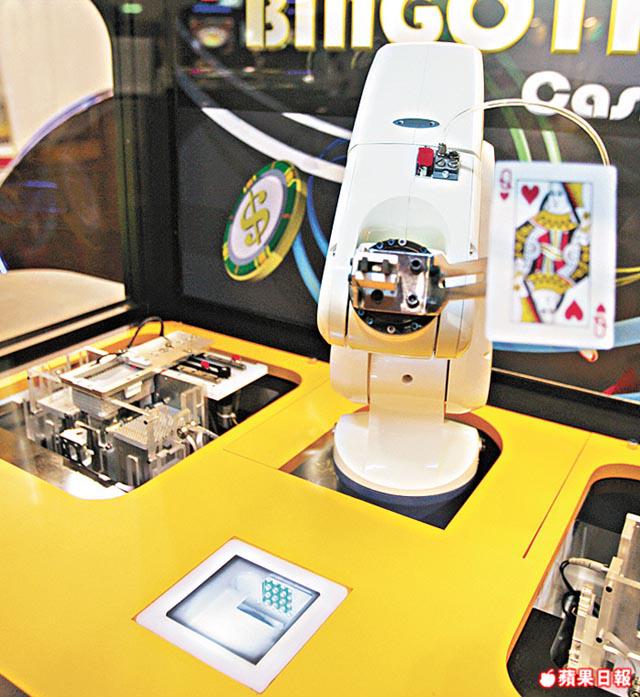 【本報訊】博彩業近年趨向電子化,正在澳門舉行的亞洲國際博彩博覽會,展出一部全自動化機械臂荷官,洗牌、派牌、揭牌甚至搖骰盅均「一手包辦」,一次最多可接待100個玩家,投注派彩全部不經人手。