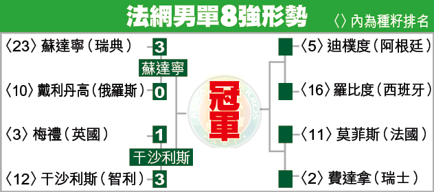 【綜合法國外電】法網「冷風」繼續吹!3號種籽英國球手梅禮在8強賽,爆冷以盤數1:3不敵12號種籽智利的干沙利斯出局;而獲勝的干沙利斯周四將與「巨人殺手」瑞典球手蘇達寧,爭奪法網決賽的入場券!(有線62台今日7:30pm起直播)
