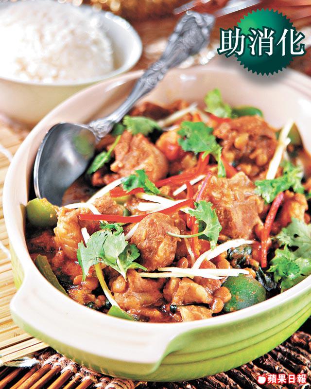 3.加扁豆及番茄煮滾,繼續用慢火燜30分鐘,加菠菜及青椒炒勻,再加惹味粉及糖調味,煮勻後上碟。再加薑絲、紅椒絲和芫荽碎做裝飾即可。