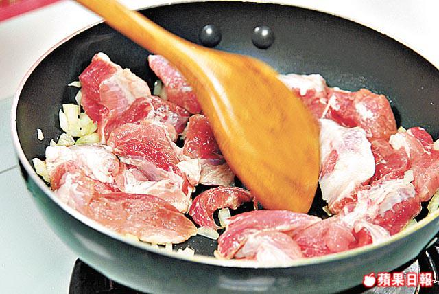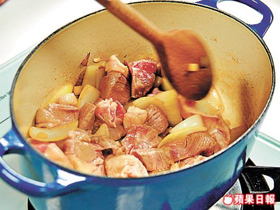 3.另起鑊把剩餘牛油煮溶,加洋葱粒及脢頭肉炒3分鐘,加甘笋、椰菜花、西芹及椰菜炒勻,然後放入(2)中煮10分鐘,下鹽及糖調味。