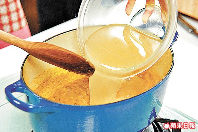 2.燒熱鑊下半份牛油,加月桂葉、肉桂枝、白胡椒粒及麪粉,細火炒至金黃,再加咖喱粉炒香,注入雞湯攪至幼滑,用慢火煮10分鐘後隔渣。