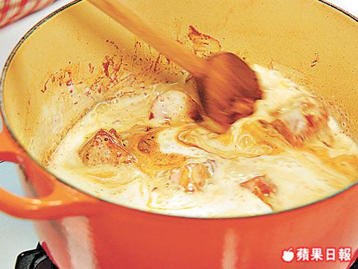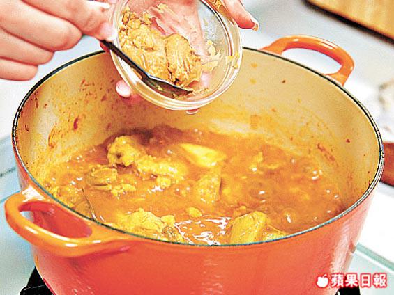 3.然後加辣椒粉、黃薑粉及少許水炒3分鐘,注入椰奶煮滾,加鹽及甘笋、椰菜花,轉中火煮5分鐘。