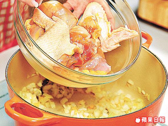 3.燒熱鑊下1茶匙椰子油,加入青沙仁、肉桂枝、丁香及月桂葉,以中火炒至青沙仁裂開,加洋葱碎炒至金黃,再加薑茸及蒜茸炒2分鐘。倒入雞件,中火炒5至7分鐘,加黃薑粉、辣椒粉及小茴香粉,以慢火炒5分鐘。