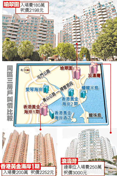 同區香港黃金海岸勝在配套更齊全,1期888方呎單位,同樣間隔3房,入場費200萬元,呎價2252元,惟向馬路嘈,而且屋苑車位由發展商持有,不及瑜翠園普遍單位連車位吸引。