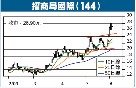 近日波羅的海指數(BDI)狂升,帶動航運股上揚,碼頭股受惠大,招商局國際(144)於5個交易日內急升32%,如以期內高位計,升幅更達37%,招商局表示5月份吞吐量跌幅收窄,而股價走勢未能再創近日新高,可能現價已反映有關消息。