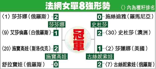 另一邊4強戰線,則會由頭號種籽俄羅斯的莎芬娜,與斯洛伐克的施寶高娃爭奪決賽入場券。