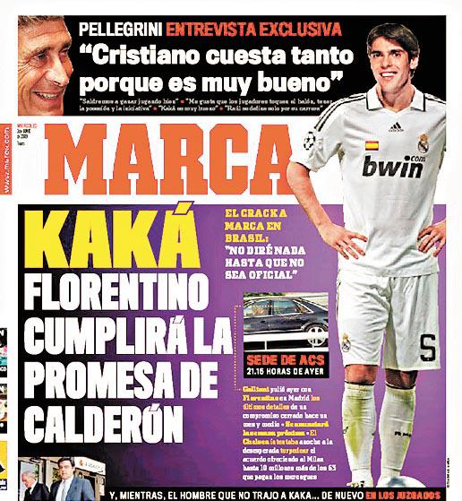 皇家馬德里有佩雷斯回巢當主席,這西班牙殿堂級人物一向言出必行,據各份報章包括《馬卡報》周三報道,AC米蘭的巴西大將卡卡,將以破世界紀錄轉會費的5,600萬鎊(約7.1億港元)來投。
