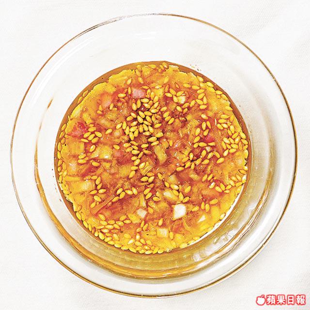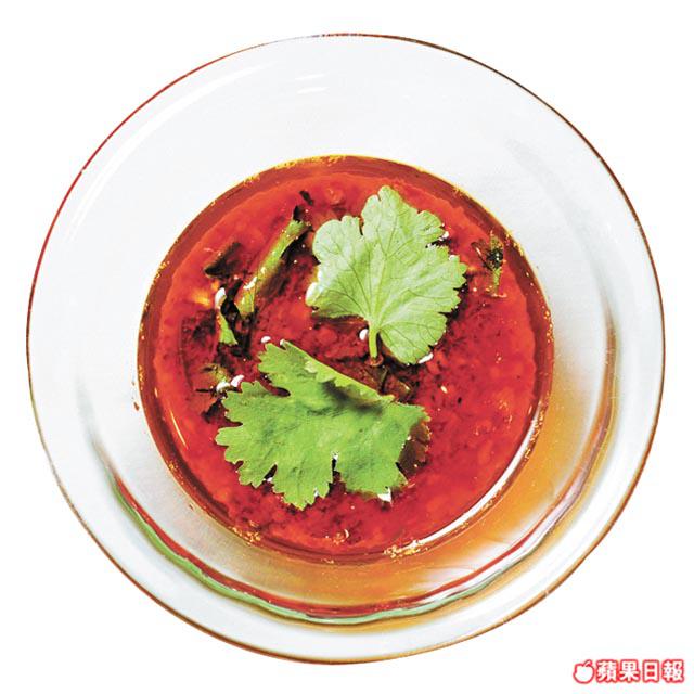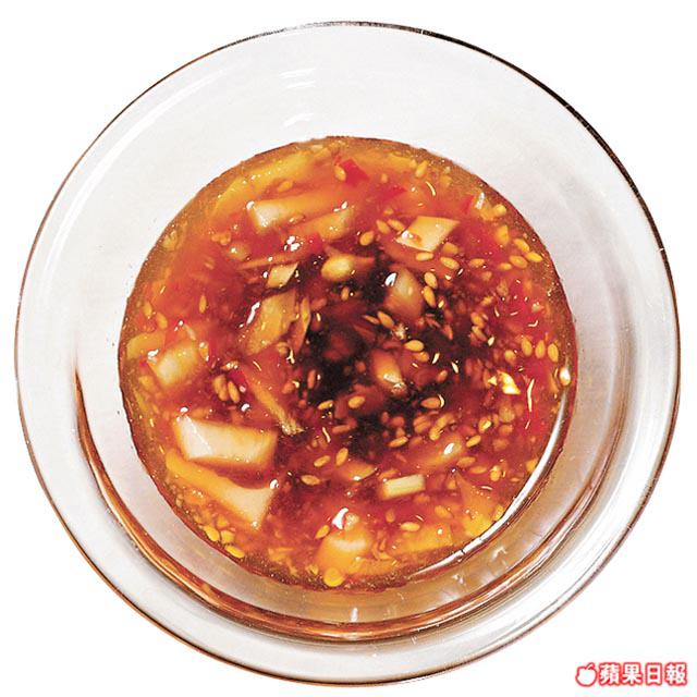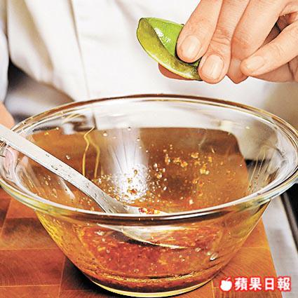 材料:泰國蝦米辣椒醬1湯匙、青檸1/2個(榨汁)、日本蟹醋2湯匙、魚露1/2半茶匙、蒜茸少許、日本三溫黃糖1/4茶匙、芫荽葉少許