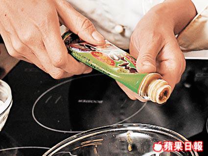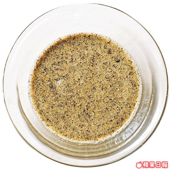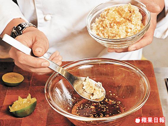 材料:黑芝麻/柚子醋各3湯匙、法國弟戎芥末醬1湯匙、日本白豉油1/2湯匙、蒜茸/鹽/黑胡椒各少許