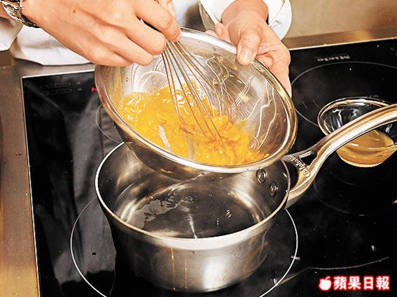 做法:全部果汁拌勻;蛋黃加雞湯以熱水坐暖,橫拂3分鐘至起泡,加鹽及胡椒粉及果汁再打3至4分鐘至起泡,以熱水坐着直至使用完。