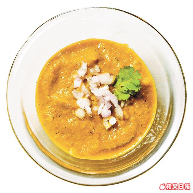 做法:中火炒香洋葱、蒜茸、南薑及香茅,加少許鹽煮5分鐘,加魚露、芫荽、咖喱粉及黃薑粉炒勻。倒入攪拌機,加青瓜、玫瑰醋、橙汁及糖攪成醬,面上放上少許乾葱碎便成。
