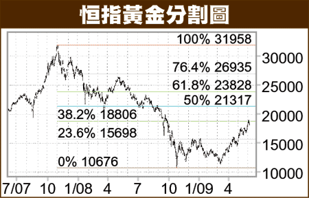 附上恒指圖表,恒指自2007年高位至去年10月低位的斐波那契(Fibonacci)黃金分割圖,顯示指數於15700、18800及21300點為反彈的主要阻力位。15700乃上次雷曼後主要阻力,至於21300點則是雷曼前主要支持點。18800會否成為今次主要的阻力,要事後才知,但絕對有必要保持警覺性。另恒指目前的市盈率是16.6倍,大約高於1985年以來的歷史平均數的1個標準差(SD),過往多次升近1個SD之後,都有阻滯。不排除瘋狂時估值去到2個標準差(22000-26000),但這需要時間。