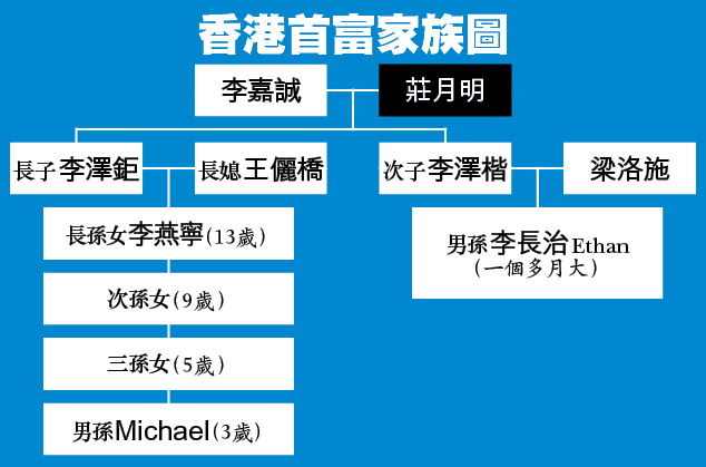 香港首富李嘉誠年屆80仍不言休,但畢竟年事已高,年前已就其王國如何接班作出安排。除了兩名兒子澤鉅和澤楷,連同兩名男孫Michael和Ethan(長治),來自潮州的李氏家族,已有四名男丁可承繼王國。