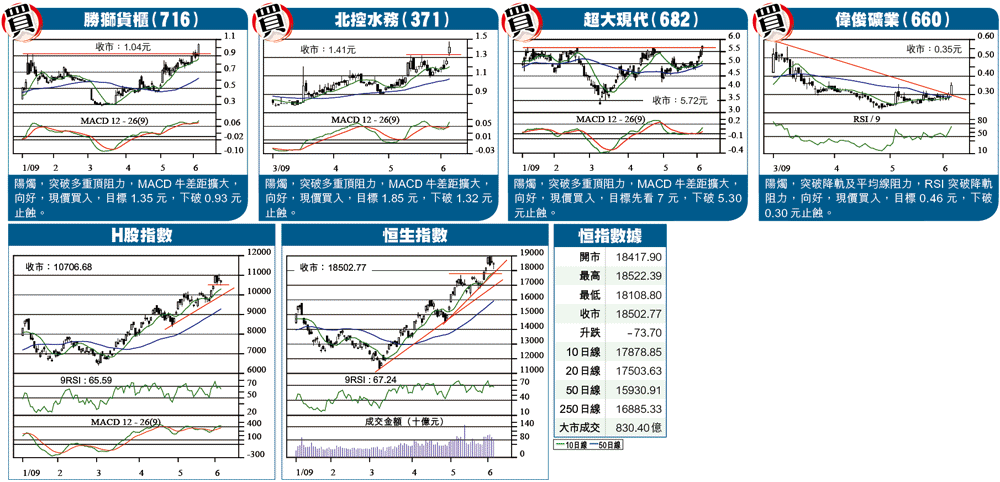 日線圖所見,射擊之星之後呈現偏淡的吊頸,並全數回補日前裂口18227至18415,走勢偏淡。惟目前這種高位震盪的走勢,令大市回穩,繼續在18500區徘徊,與牛皮悶市不同的是,單日波幅非常之大,一日之間,不論好友淡友,均會經歷一次天堂地獄,可見大市在震盪中上試高位的走勢,是多麼令人不安。值得留意的是,大市在低位見支持,可能顯示高位派貨仍需時,暫時未有急挫的危機,惟大戶出貨越沽越高,宜小心。