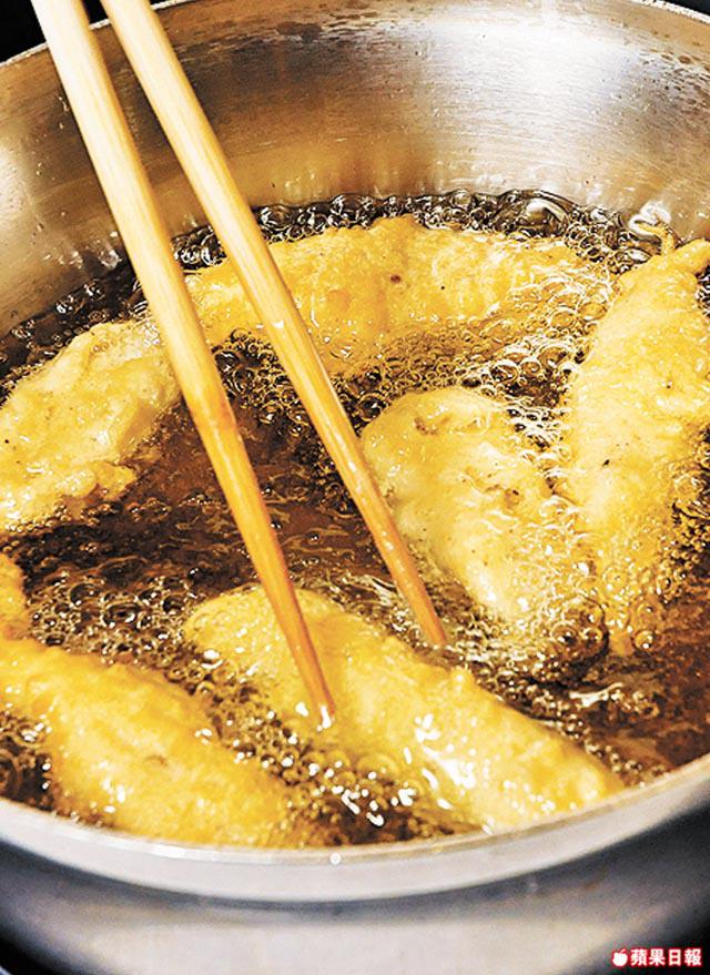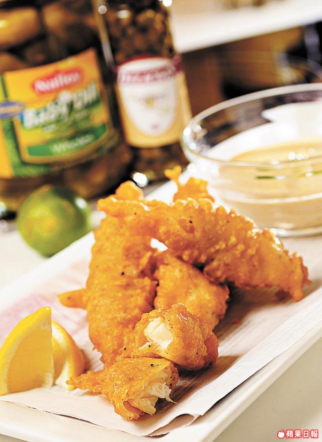 2.燒滾油至180度,魚件蘸炸漿下鑊,大火炸至表面轉硬,轉中火炸11/2分鐘便可上碟,吃時蘸他他汁共食。