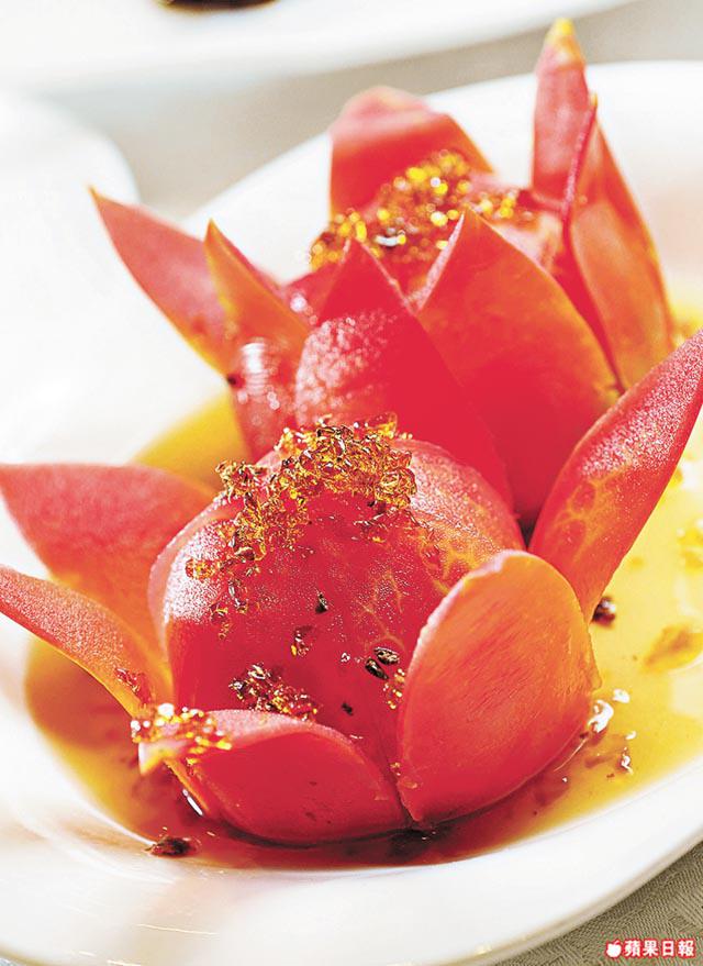 3.把浸過夜的番茄輕輕反起皮成蓮花狀,淋上話梅花雕,撒上花雕啫喱即成。