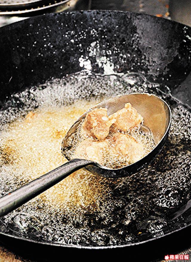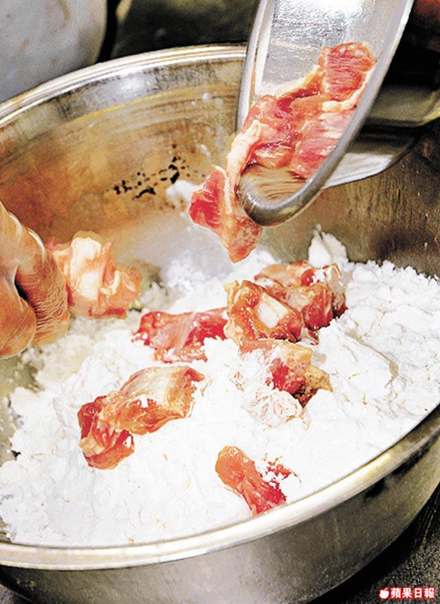 1.排骨用鹽醃15分鐘,拍上生粉。燒滾油至180度,大火炸至浮起及金黃色,撈起。