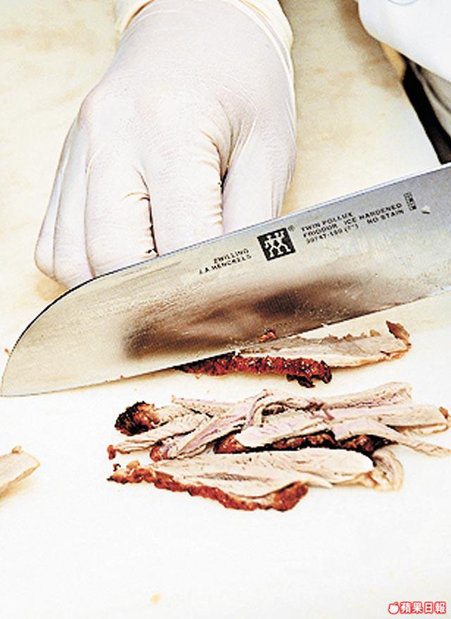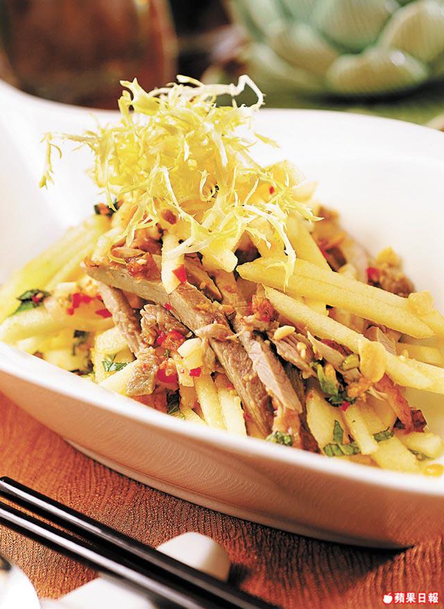 富士蘋果2個、金不換8克(切絲)、燒鴨胸肉60克(切絲)、乾葱10克(切圈)、花生碎10克、炸蒜5克