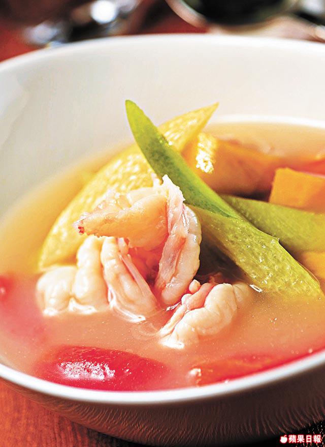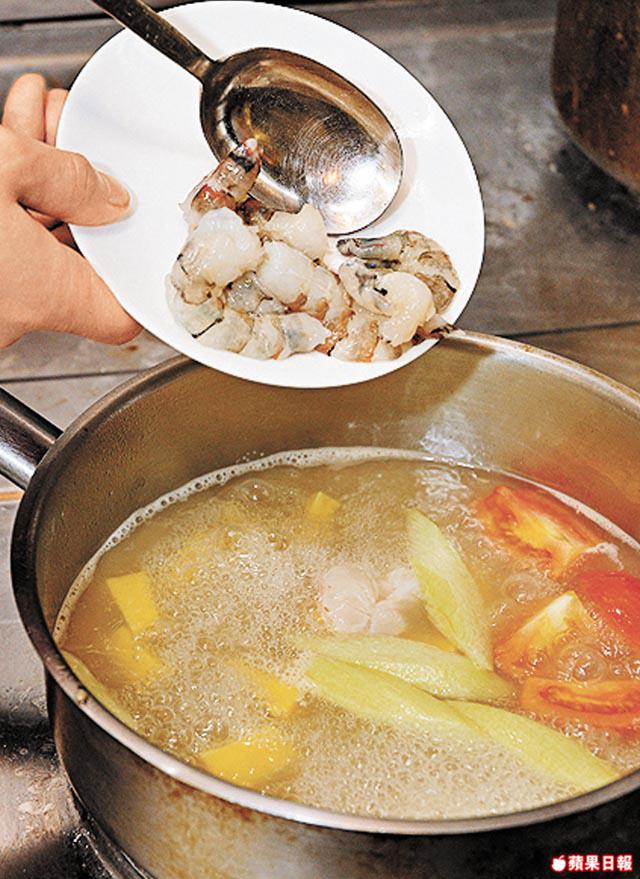 2.煲滾上湯,加青檸汁、糖及紅椒煮滾,再加蝦肉、番茄及菠蘿,慢火煲半小時。
