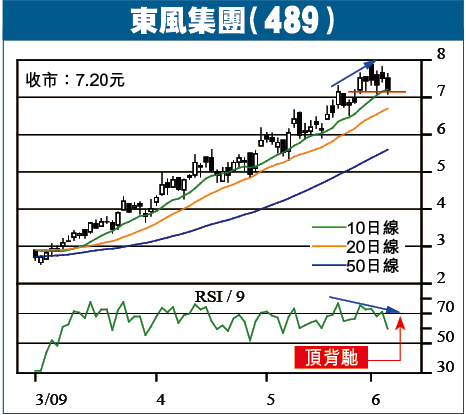 東風集團(489)在今次升浪中特別強勁,自今年3月起計累升近270%,從周線圖可見,上周RSI升至最高95的嚴重超買水平,股價也逼近07年底高位,再強也得先行整固。日線圖上,東風過去3個月9RSI已呈複式頂背馳,股價日後或有機會破07年高位,但短期再升空間肯定有限。